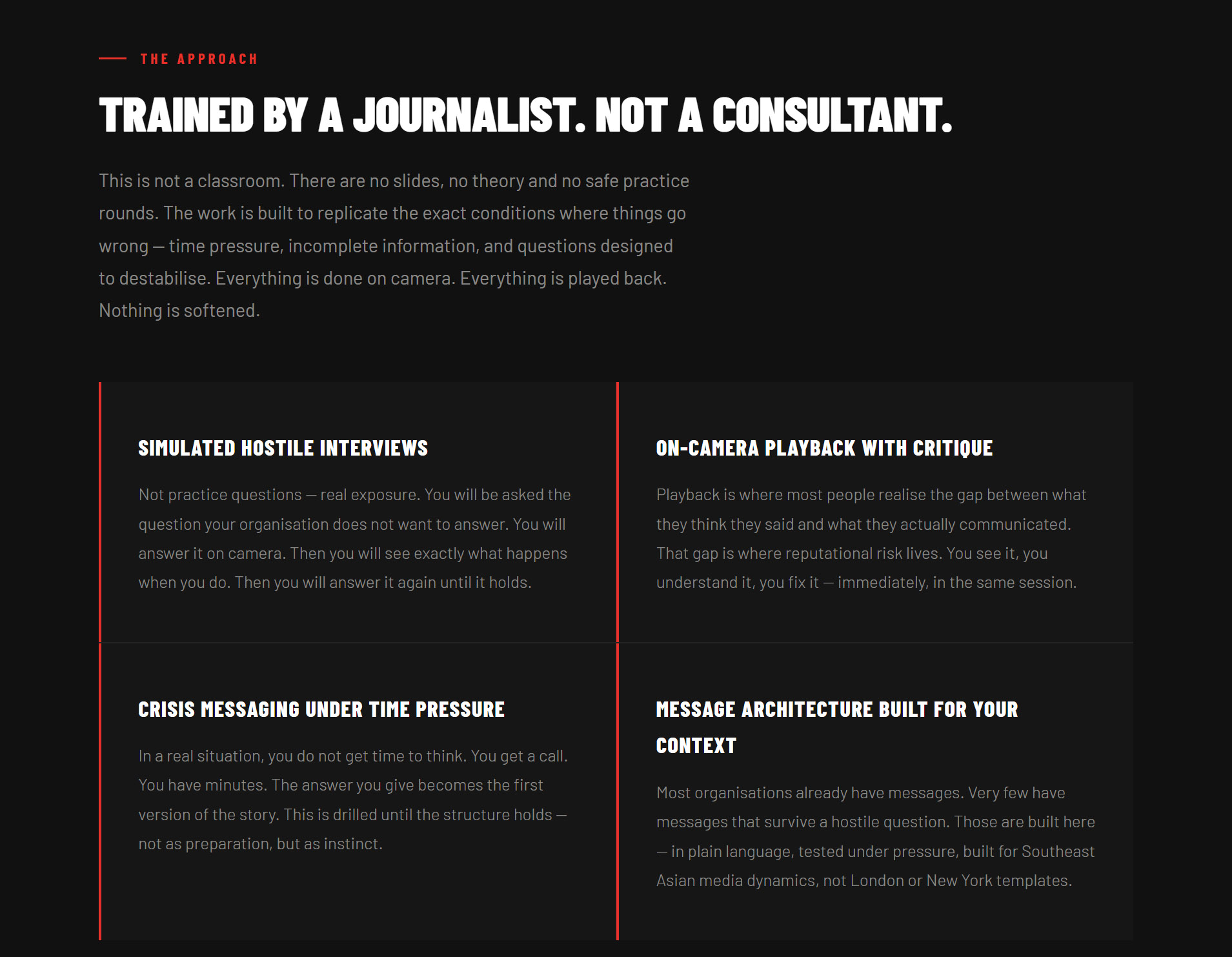 Die ervaring vormt de basis van mijn trainingen. Niet hoe iemand “goed overkomt”, maar hoe interviews daadwerkelijk verlopen: waar ze kantelen, hoe vragen worden opgebouwd en wat er gebeurt met antwoorden zodra ze de publieke ruimte ingaan.