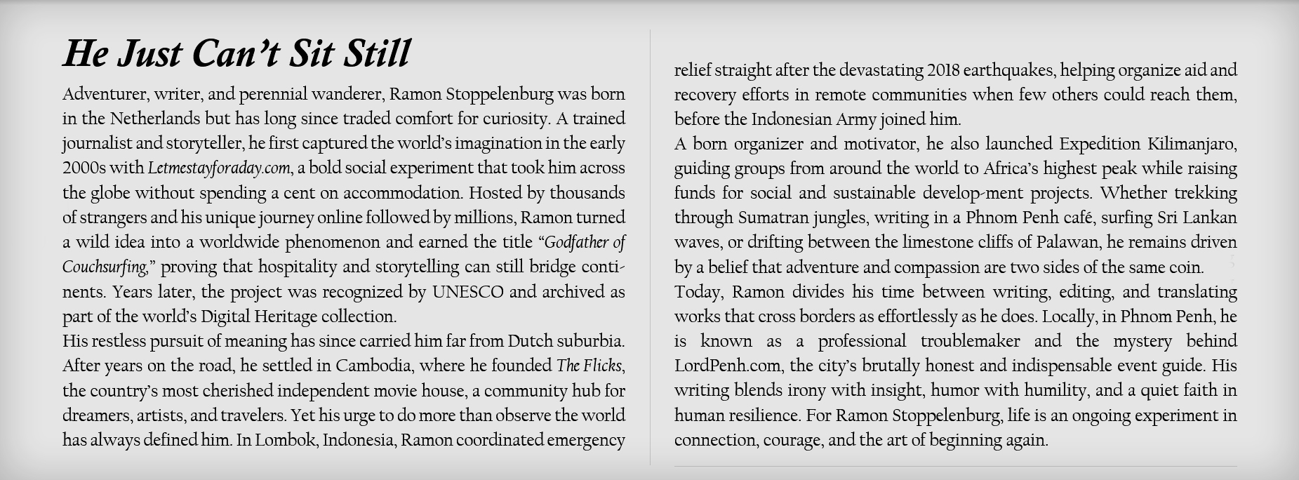 Even een waarschuwing: wat volgt kan een beetje overweldigend zijn met al die avonturen en projecten. Dit is niet bedoeld om indruk te maken, maar om eerlijk te laten zien hoe ik bewust een leven leid dat grenzen, sectoren en mogelijkheden overstijgt. Ik heb namelijk nooit geloofd in het kiezen van één pad, en als dat te veel lijkt, nou, dat is precies hoe ik het altijd heb gewild.